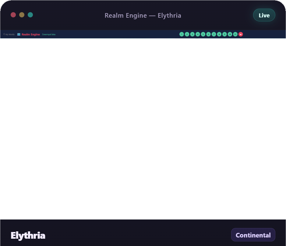 Build worlds in Realm Engine, run travel here, fight in Conflict Engine, and play on Veil — all from the same world data.